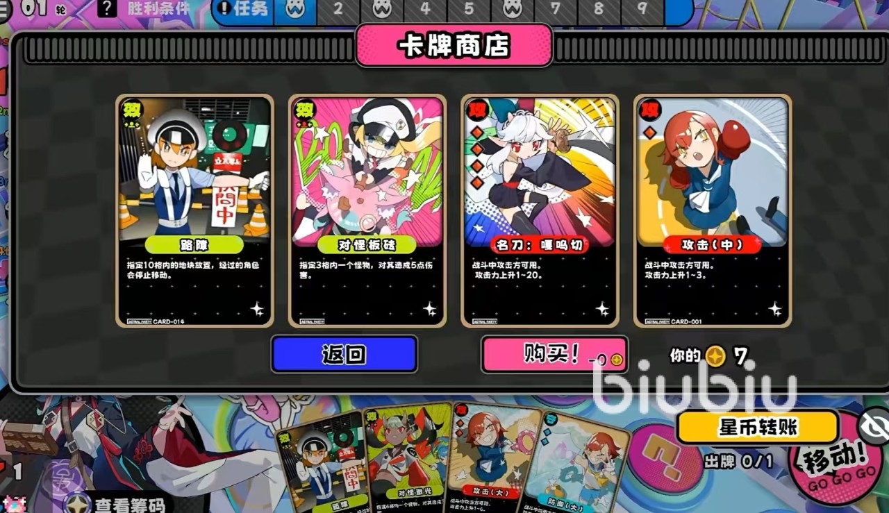 在游戏过程中,玩家通过轮流掷骰子的方式来决定前进的格数,地图中划分为多种不同的地块,不同地块会触发不同的随机事件。这样在搭配上角色专属的主动和被动技能以及各类卡牌,让每场战斗都变得具有随机性,玩家需要合理利用技能卡牌来灵活适配战局。游戏胜负的核心就在于收集的星星,胜负只看最后星星的数量。当玩家攒够10枚金币后,就可以到个人出生点或者是中心点兑换一颗星星,每次只能够兑换一颗。至于战斗、陷阱等随机出现的各种事件结算,都在兑换星星之前。