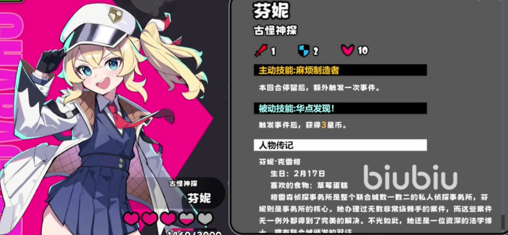 古怪侦探的全名是芬妮·克雷格,2月17日出生的她超爱草莓蛋糕,是妥妥的甜妹属性哦。数据方面,她的金钱收益能达到5点,打架能力2点、操作性能1点,1攻2防10血的基础属性,整体上属于稳扎稳打的类型,没有特别亮眼的地方,但也特别明显的短板。