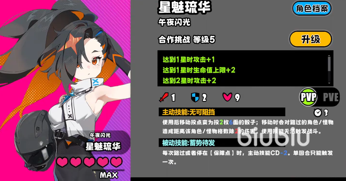 除了主动技能之外,午夜闪光还有一个被动技能叫做蓄势待发,效果为每当路过或者是停留在【保障点】的时候,主动技能的CD都会-2,单个回合只能触发一次。面板来看,午夜闪光的最低基础面板是攻1防1血9,在达到一星时攻击加1,等级2一星时生命上线加2,等级三2星时攻击加2,等级4三星时攻击加1移动加2。