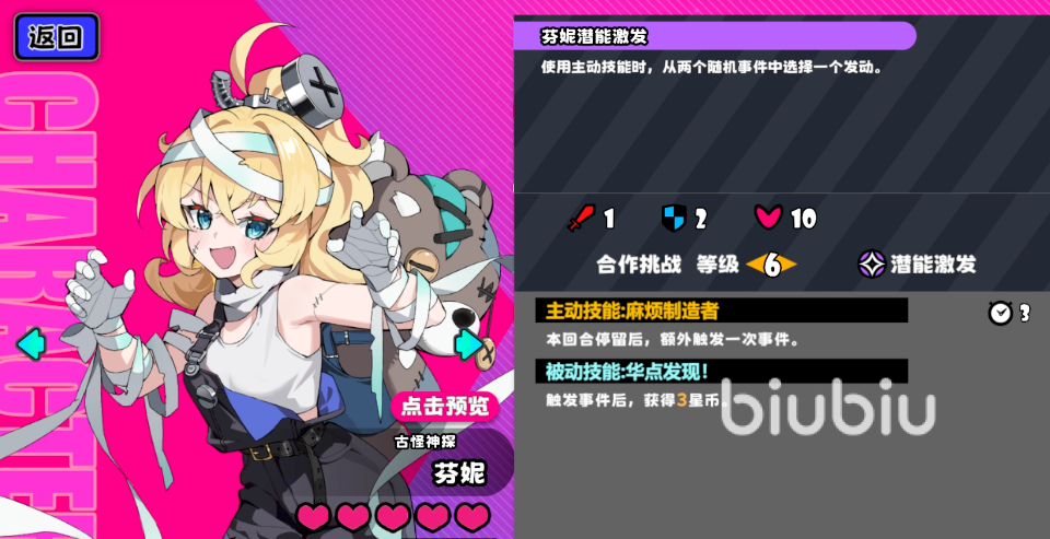 芬妮:激发之后可以先选事件,选完直接发三星币,是所有角色当中最容易开局秒一的角色。核心筹码以赚钱筹码,是目前性价比较高的赚钱角色。优势选项可以考虑走治愈,提高生存能力。