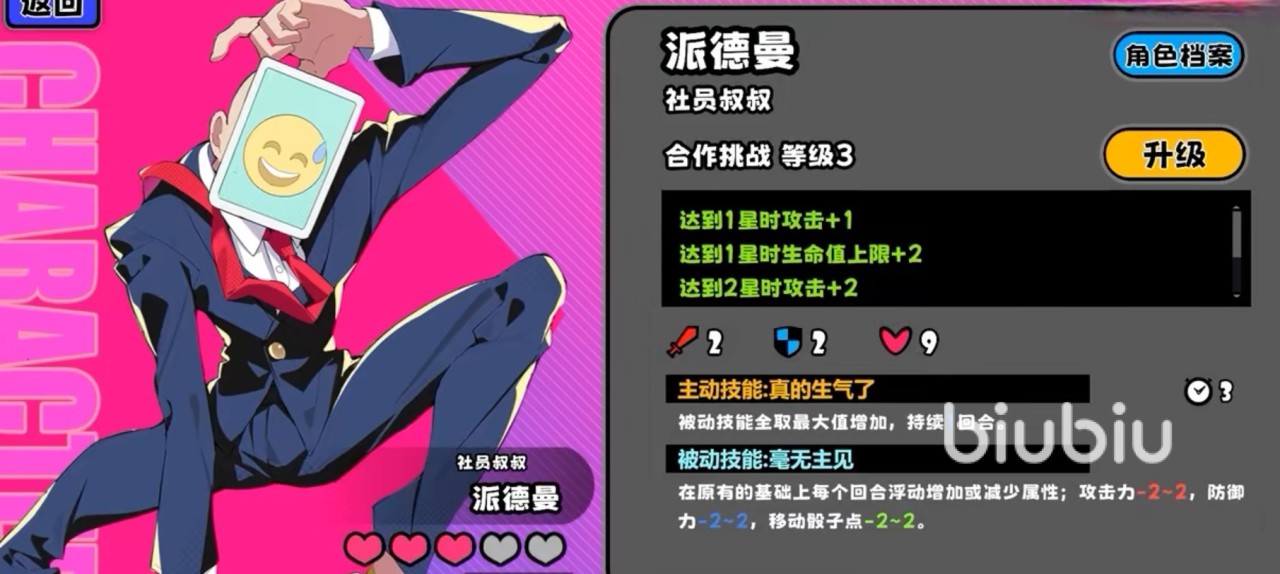 当他的合作挑战等级达到1星的时候,攻击力与生命值上限都会增加,前者会加1点,后者可以加2点,达到2星的时候,攻击能加2点,达到3星的时候,攻击力能加1点,移动速度可以加2点,还能获得2次重选强化筹码的机会,获得星星时,可以得到1次额外重选强化筹码的机会。
