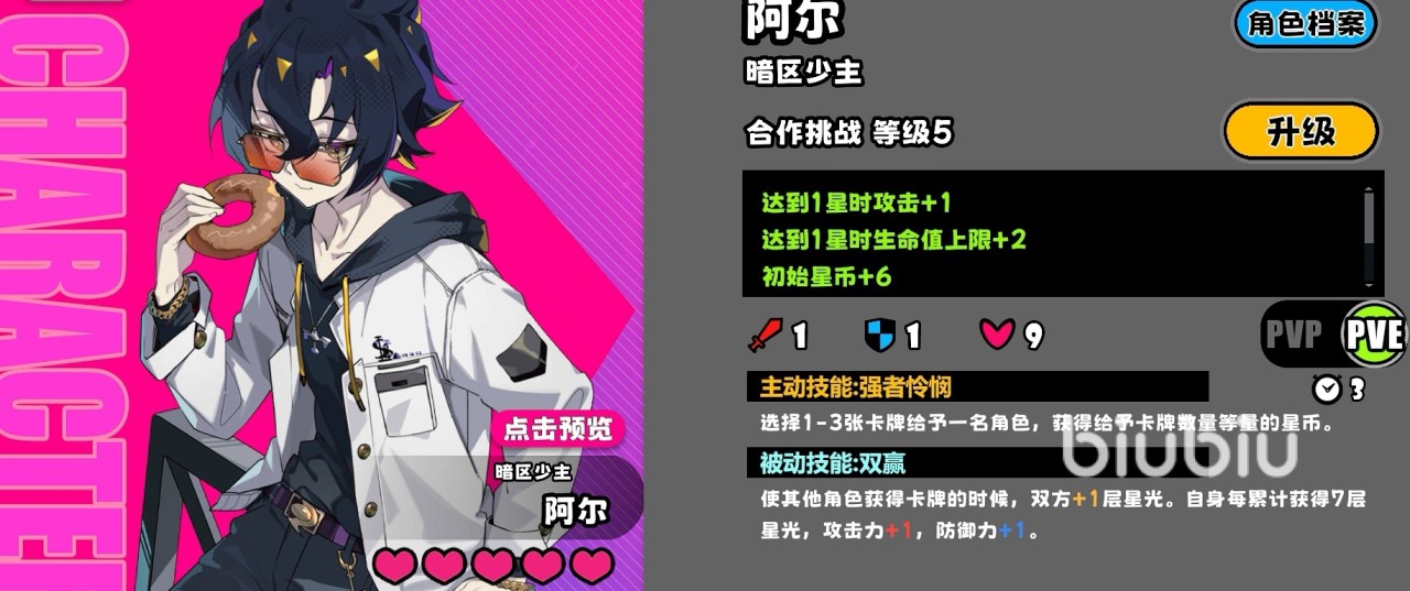 他的被动技能有两个,分别是【钞能力】与【双赢】,触发【钞能力】的条件就是获得星币,此时的阿尔会增加1点防御力与2点攻击力,效果持续2回合。触发【双赢】的条件是要让其他角色获得卡牌,这时候双方的星光层数会加1,自身每累计获得7层星光,他的攻击力与防御力都会加1。