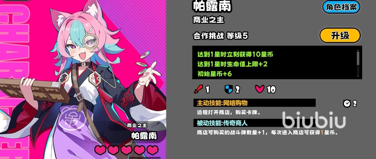 帕露南的主动技能是【网络购物】,使用这个技能后,帕露南会远程打开商店,从而购买卡片。被动技能是【传奇商人】,触发之后,能让玩家在商店的可购买次数增加1次,每次进入商店可获得1星币。帕露南的合作挑战等级达到1星时,会立刻得到10个星币,生命值上限可以加2点,初始星币能加6,达到3星的时候,她的攻击力、防御值以及移动速度都可以加1点,重选强化筹码的次数能加2次。