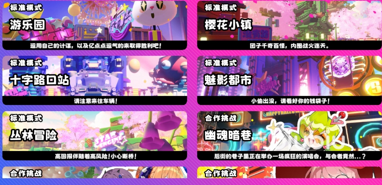 标准模式地图(PVP):游乐园、樱花小镇、十字路口站、魅影都市、丛林冒险。