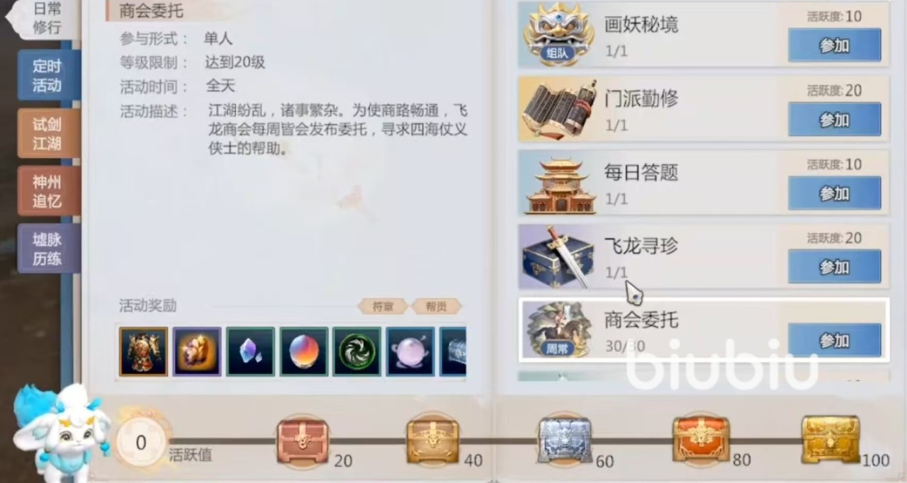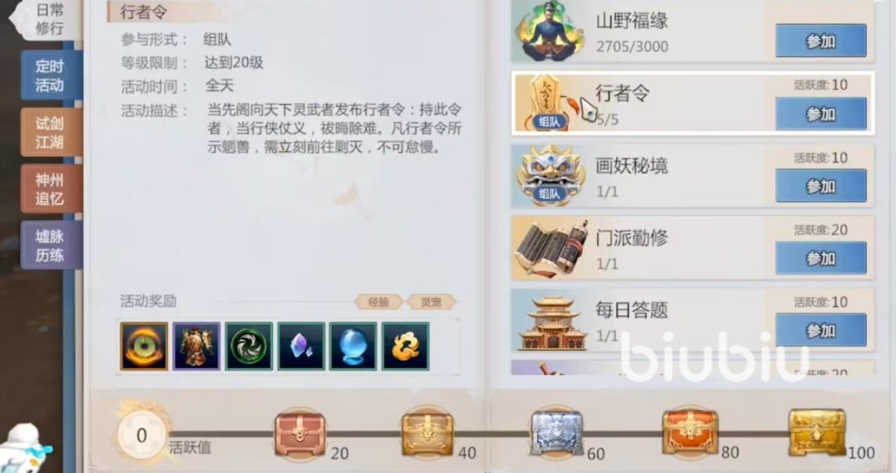 行者令也是20级就可以参加,需要组队的形式参与,内容主要是和各种怪物进行战斗,奖励经验装备等道具,每天可以完成5次,奖励10点活跃度每次。画妖秘境也是组队的形式,每天可以完成一次,给予10点活跃度,完成之后有机会获得息玉,使用后随机获得一只灵宠。门派行修是单人活动,主要是回自己的门派出完成任务,给予20点活跃度。每日答题只需要15级就可以加入进来,只需要完成几个很简单的题目就能拿到奖励。