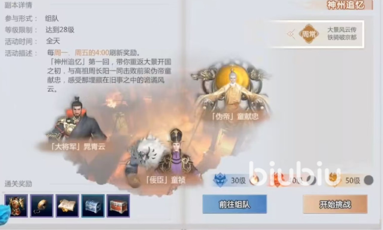 大家打开游戏的活动功能后,直接就可以找到神州追忆,这是属于周常玩法,也就是以周为单位刷新,需要组队参加,必须达到28级以上才可以加入进来,活动没有时间限制,全天都可以加入进去。该活动在每周的周一和周五4点刷新奖励,神州追忆也分为不同的回合,第一回将带领玩家重返大景开国之初,和高祖周长阳一同去击败伪帝童献忠,并感受埋藏在旧事中的诡谲风云。