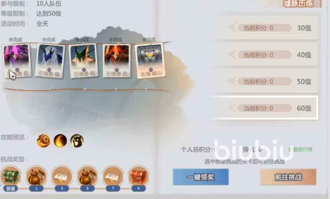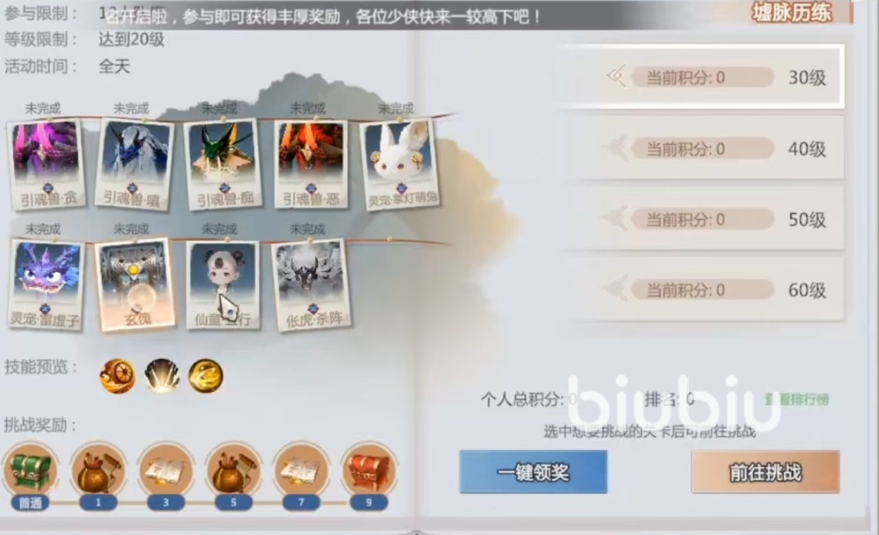 在打开活动功能之后,找到墟脉历练就可以看到这一项玩法了,这是需要达到20级才可以加入进来的活动,这里面提供了多个不同的boss供大家去挑战。而且是按照等级进行划分的,分为30级,40级,50级,60级,随着挑战等级提高,boss也会获得更多的技能属性。