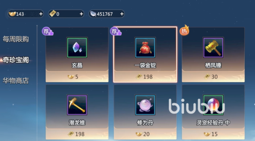 还有就是商店系统,这个商店每周都会刷新物品,其中限购商店内会不定期刷新高品质武器,就是价格比较贵,对于缺少强力装备的玩家是可以选择购买一手,同时也可以去看看奇珍宝阁或者华物商店,可以刷出一些高品质的道具,用于提升角色的装备。