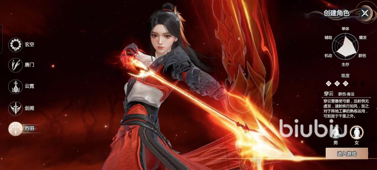 该门派的定位是远程输出型角色,以长弓为武器,在战场上有着非常灵活的身法,应对很多战斗都游刃有余。自身的技能也多数多和这样的输出方式有关,例如满弓这个技能,处于远射状态时,蓄力时间越久,所包含的威力也就越大。如果能够把握好时机,将触发完美一击,这样打出的伤害直接爆表。另外还有技能例如流火,只需要锁定好指定区域,就可以召唤来漫天箭雨,如流星一般坠落到区域之内,造成强力范围伤害。在战斗中烈羽的控制和反攻制能力也都是非常出色的,可以应对战场上突然出现的各种近身威胁,能保证自身随时都处于安全情况下,持续不断地打出输出收割战场。