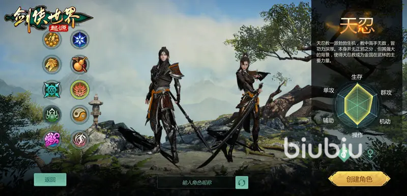 2、天忍门派,这是十大门派当中可以说是神秘度最高的一个了,如果选择职业的话可以有魔天忍和战天忍。成为魔天忍的话,基本上就是以远程的内功为主了,主要的属性就是内功,使用的一半都是实力强大的火系技能,而且对对手具有灼烧的效果,远程使用的时候攻击性比较强;如果选择成为战天忍的话,那么这就是主要使用外功的了,比较适合近身作战的职业,力量是他们的,一枪甚至可以击穿对手,造成伤害的同时,可以根据伤害比例来对血量和内力进行回复的职业。