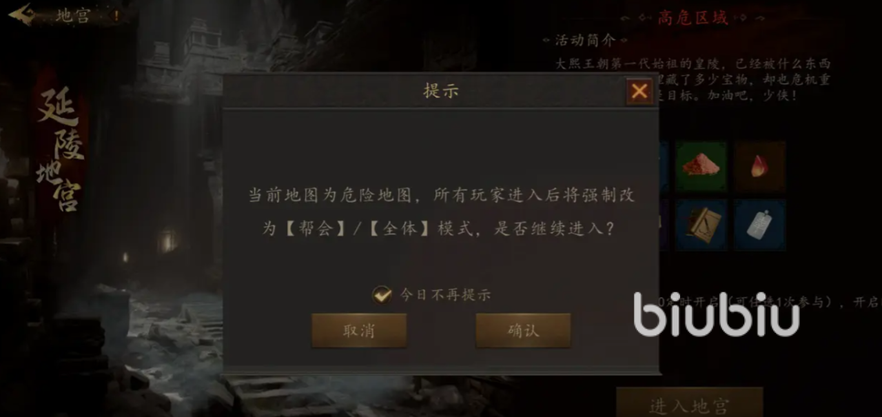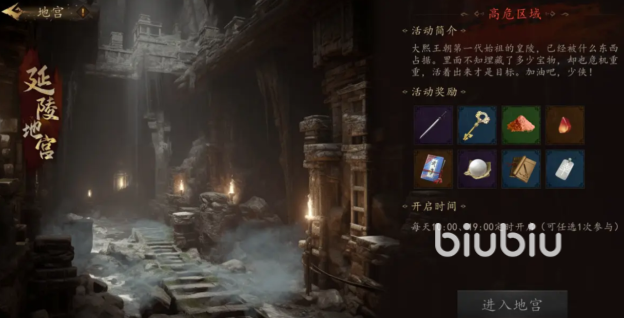 延陵地宫是非常高危的区域,所有玩家在进入后都会强制更改为帮会或全体模式,这期间内侠客之间的战斗将不会产生罪恶值,进入到地宫后,少侠们将被随机传送到地宫的外圈边,地宫内的地图将开启迷雾模式,只有红色和蓝色的标记,红色标明离开地宫,蓝色标记代表前往下一层,地宫是限时的会显示剩余时间,大家需要在倒计时结束前及时离开;
