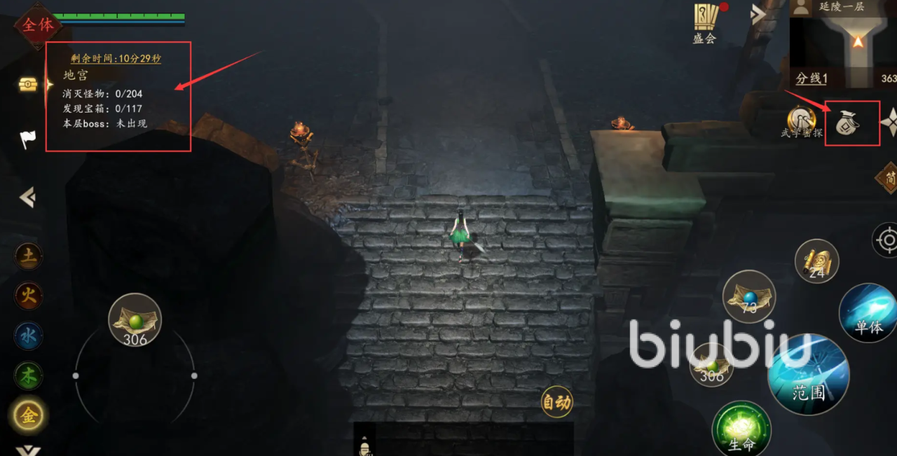除了笨笨机关牛外其他的小怪都有敏捷和坚韧的词缀,地宫中的宝箱也有三种,分别是不需要钥匙就能打开的白宝箱、和需要钥匙才能打开的银色和金色宝箱,打开银色和金色的钥匙是相同的,地宫boss在没有人激活的情况下会显示未出现,一层的boss是神荼天王,需要对话地图正中央的棺材才能激活,boss被击败后会开启通往二层的传送门,同时状态标记为已击杀。