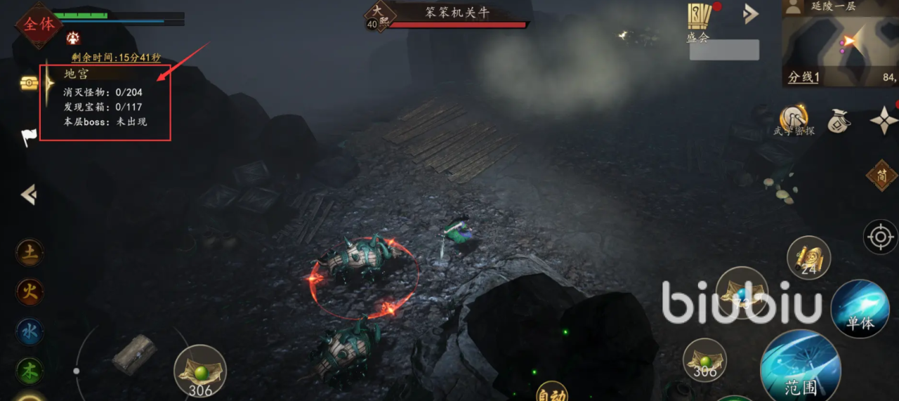 地宫目前的开启时间是每天12点到17点,每一场持续时间为20分钟,可以在秘闻中点击地宫,或者在开始的时候点击小地图旁边的铃铛进入,进入后的第一件事情是要把全体模式改成帮会,避免对帮会成员也产生误伤,在左侧任务栏的位置能看到本场地宫的剩余时间,大家可以时刻注意好,时间的下面还显示了地图中小怪的数量,当消灭怪物和总数相同,则表面本次地宫中已经不存在小怪,地宫中的小怪目前有四种,分别是等级40的笨笨机关牛、50级的机关弩手、50级的潜龙怪、60级的机关锤手;