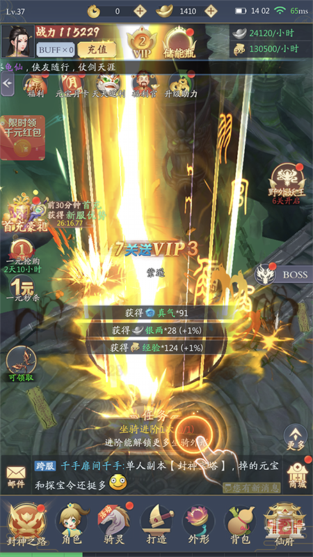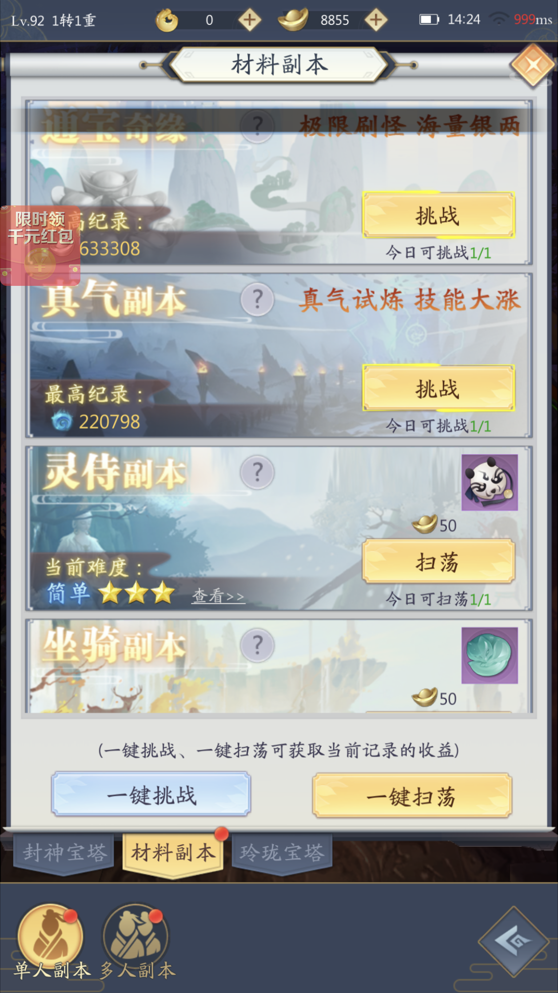 游戏中的副本也是每日必刷的。副本又分为单人副本和多人副本。单人副本中的封神宝塔和玲珑宝塔是根据角色的战力值来推进,战力越高,通关的层数越高,获得的奖励越多,只要战力提升达标了就去挑战一下。