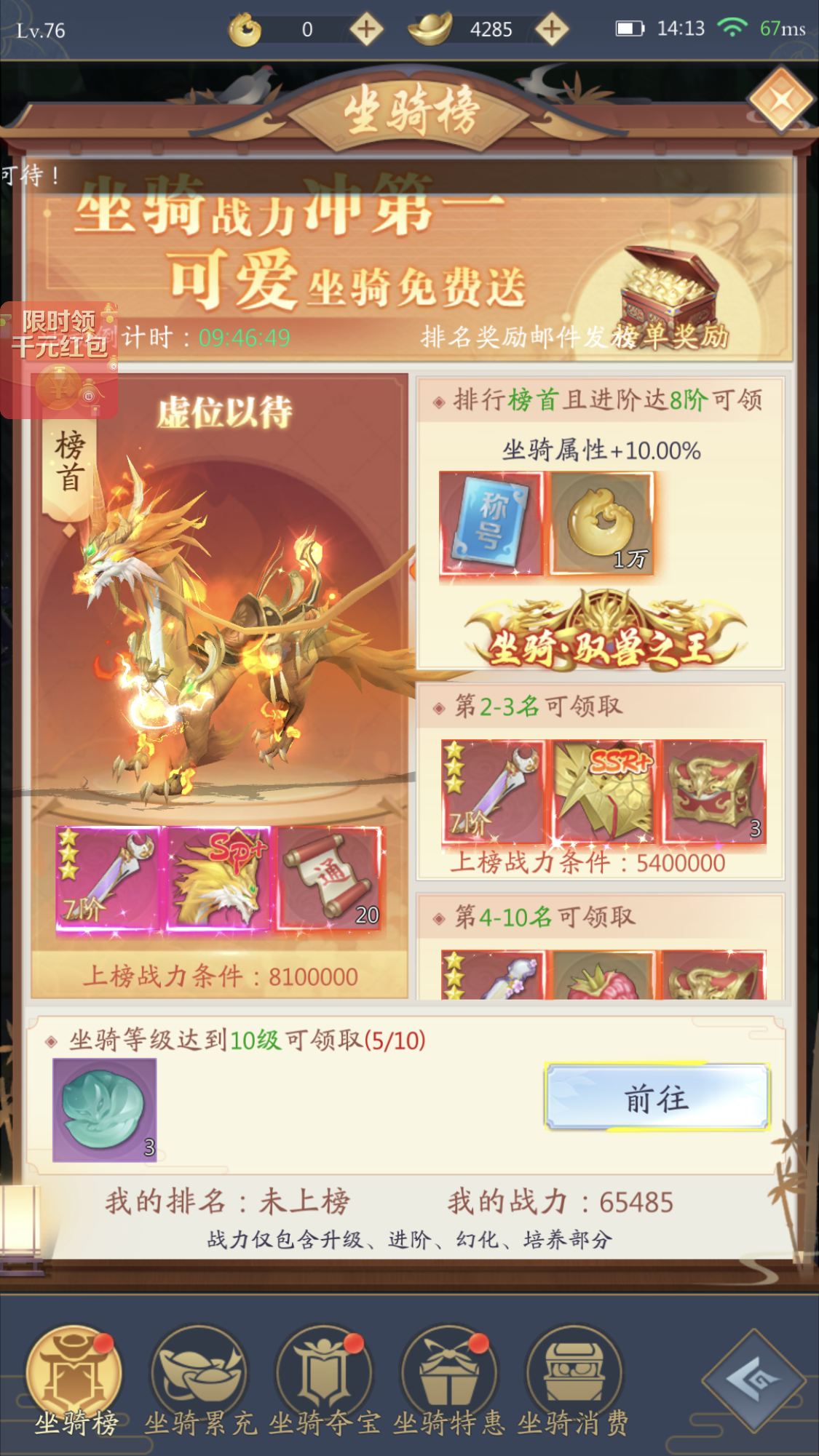 在新手阶段,进入的是新的服务器能赶得上服务器的冲榜活动。冲榜活动是提高角色实力的一个重要途径,每日游戏开放的冲榜活动各不相同,一般首日是坐骑榜,后面会逐步开放灵侍、灵契、时装等等。冲榜活动给的奖励是十分丰厚的,能够迅速提高角色的战力值。不氪金的玩家很难拿到榜首的奖励,但是前20名还是可以争取的。