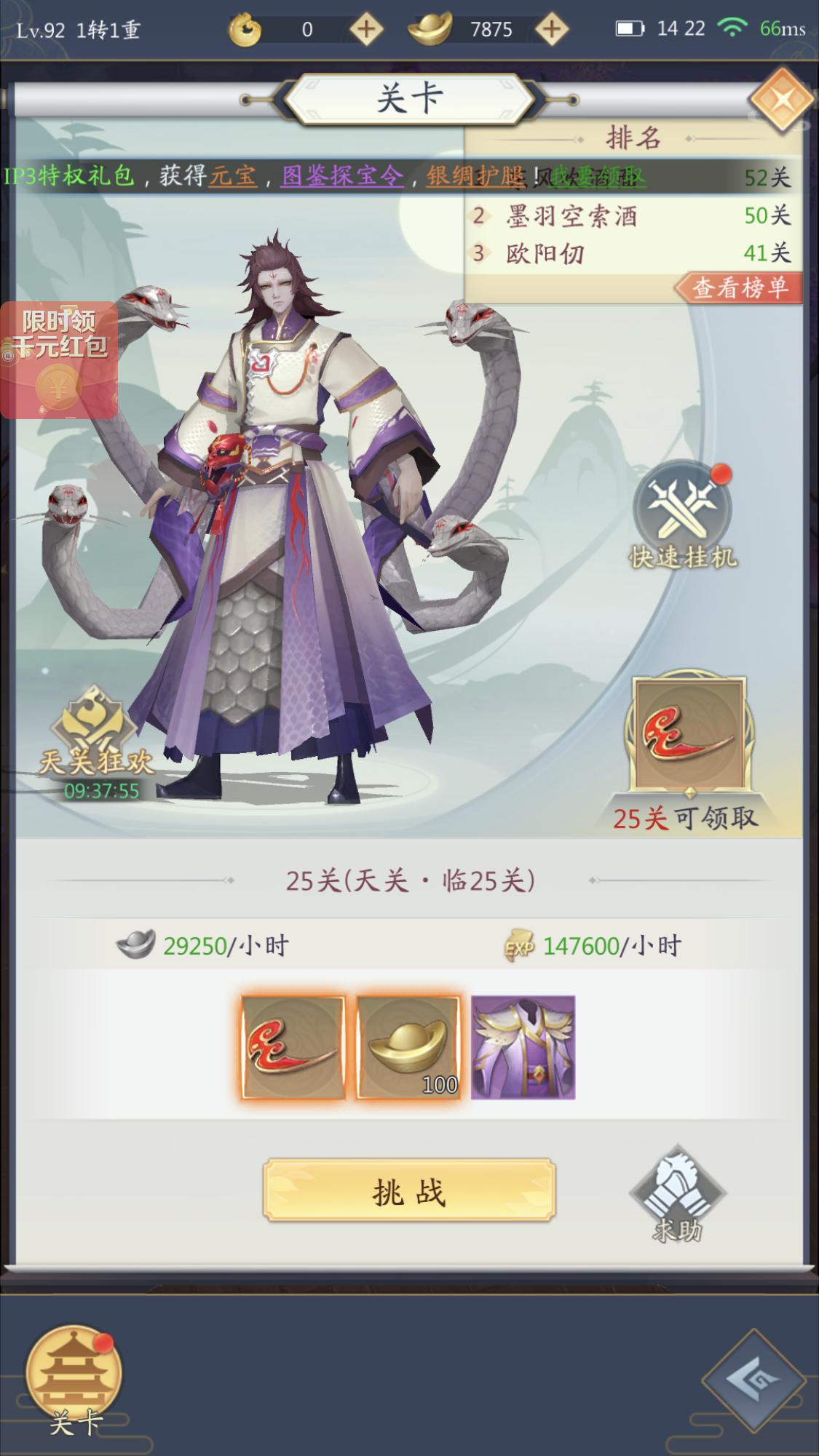 主线关卡是游戏中最重要的一个部分,通关主线关卡每一个关卡都能获得元宝的奖励,并且提高游戏角色每个小时获取的经验值,还能获得紫装蓝装的装备奖励。要想等级跟得上大部队,主线关卡的过关数量是一定要跟上的,实力越高,能够通关的关卡数量就越多。主线关卡的通关关数只和实力有关,没有其他的限制条件。当日的通关层数达到极限不能再前进下去时,可以在关卡页面进行快速挂机获得大量经验提高等级。