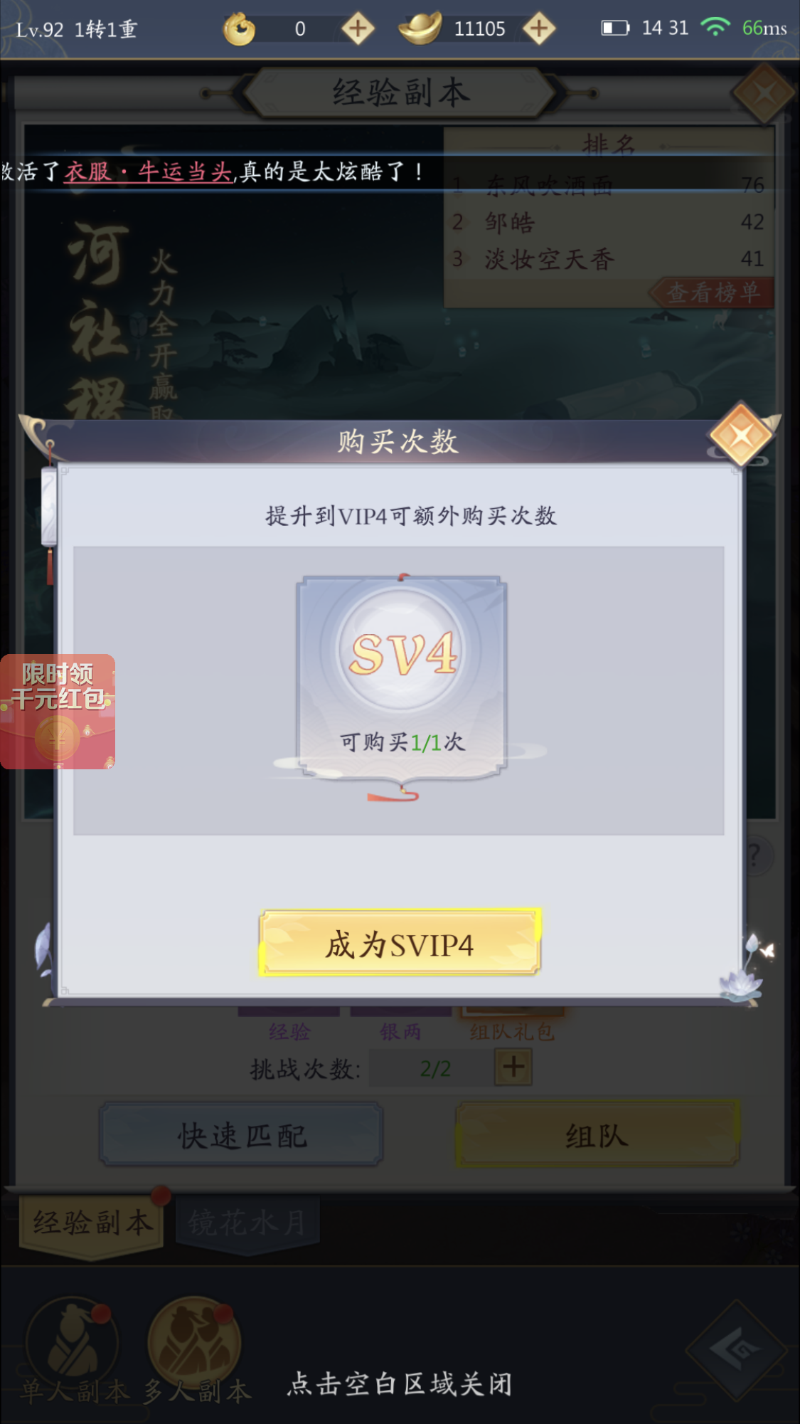 经验副本方面,与主线关卡情况类似,一方面是提升自己的战力在增加自己在经验副本中通关层数。如果自己的战力提升难度太高,可以抱个大腿,找个战力特别高的玩家来带自己过副本,这个游戏中氪金玩家的战力与普通玩家的战力差距是巨大的,有人带没人带的经验差距很大。另一方面,增加当日的经验副本可进入次数,有时候开放的充值活动有赠送道具,SVIP4级以上可以购买更多的副本次数。