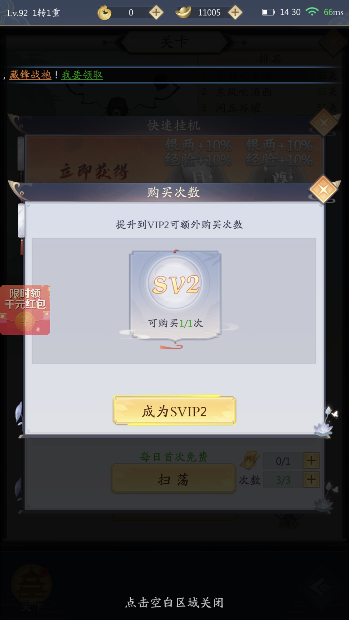 继续提升SVIP等级每日可以购买的扫荡次数还可以提升。进行快速扫荡要注意将能获得的经验值最大化,在每日活动都完成,角色战力已经不能再提升,主线关卡数不能再推进的情况下再进行扫荡。