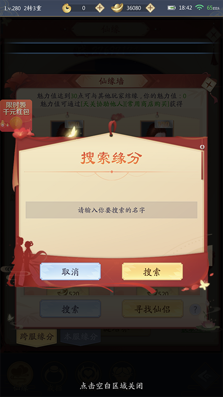 这个搜索功能是用于两个玩家在跨服频道、世界频道等聊天栏中的频道约定好要结为仙缘,一个玩家在仙缘墙中发布了自己,另外一个玩家即可使用搜索功能去找到该玩家两人结为仙缘。