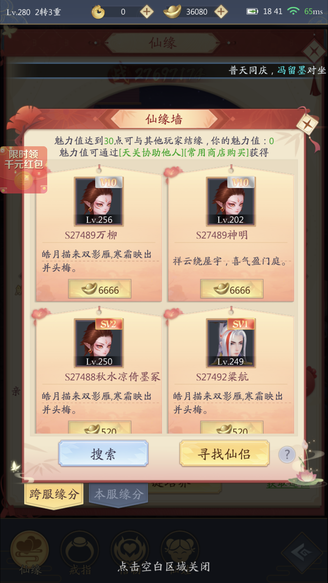 九州八荒录中虽然不能添加其他玩家为好友,但是还是能够搜索到其他玩家,那就是在游戏的仙缘模块中的仙缘墙中。在仙缘墙有个搜索的按钮,点击可以输入其他玩家的名字来搜索这个玩家,搜索可分为跨服搜索和本服搜索,但这个搜索仅限于是对方在仙缘墙上发布了自己。