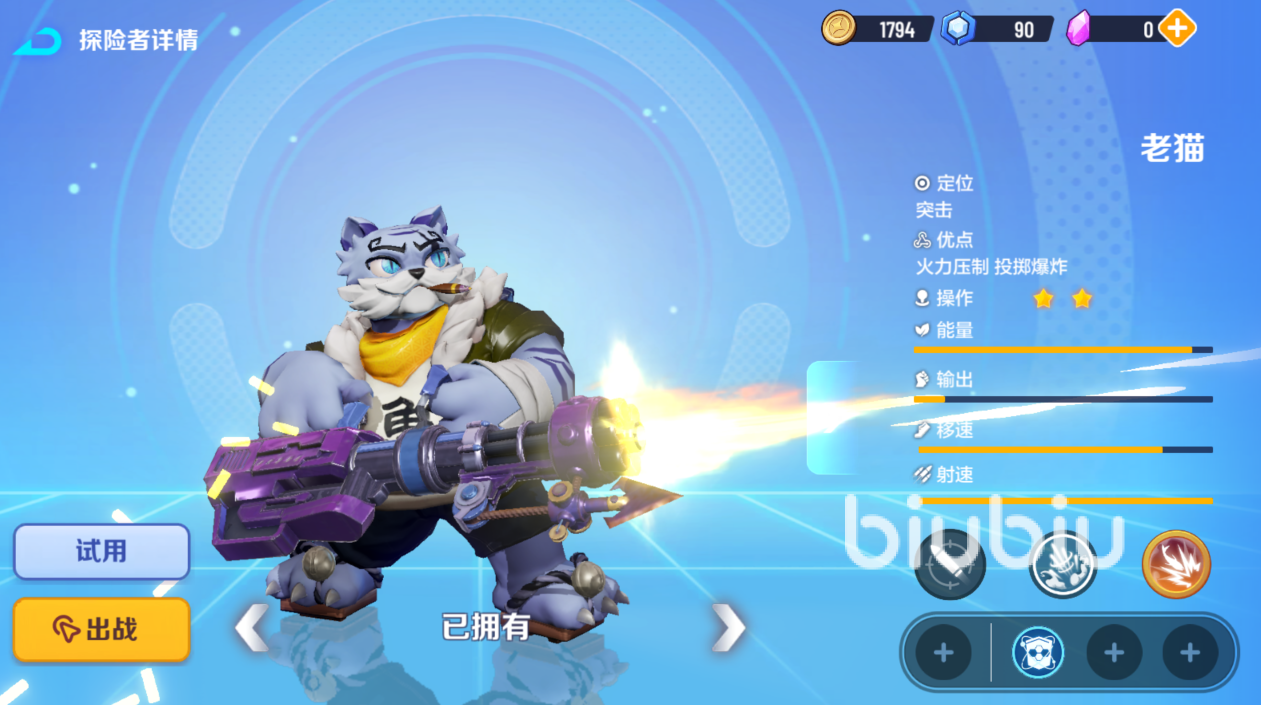 最后是老猫,他举着一把朴实无华的加特林,以超短的时间速度快速发射子弹,虽然每颗子弹对敌人的伤害值不大,但是一直处于输出中,也会对敌人造成严重伤害。