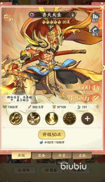 齐天大圣的被动会在生命首次低于30%的时候,解除神兽的所有控制并直接恢复战斗力,他的“灵猴棍法”在使用后会临时提升自己20%破甲,随后打出3次连击,对全部敌人造成122%的伤害并让自身获得一层灵猴,灵猴可叠加,能永久提升携带者1%的攻击力与暴击率。