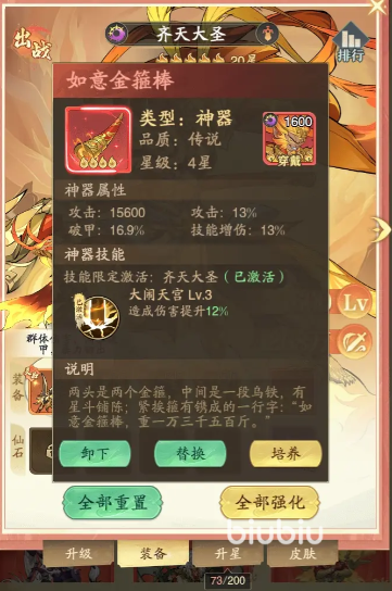 他的专属神器为如意金箍棒,不仅能带来增伤和破甲等属性效果,还可以激活限定技并提升他的速度,若是没有获取,也可以给它携带上轩辕剑或者昊天塔,这两个红色神器也有很高的暴击收益。