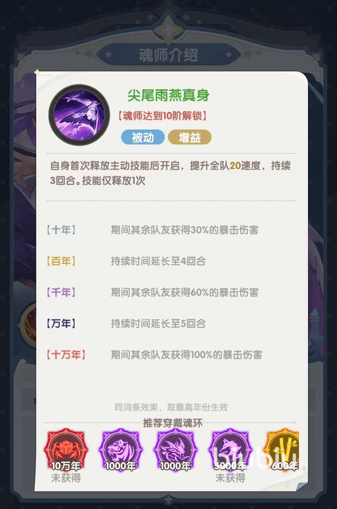 第2个被动踏燕,使自身的普攻变成对一个随机目标造成伤害,优先选择对方的辅助系魂师,还可以使目标额外降低暴击抵抗,为目标附加易伤,使其接下来受到伤害时会有额外的加成。第3个被动尖尾雨燕真身,在首次释放主动技能后就会开启武魂真身,提升全队所有队员的速度,持续三回合。同时还能够使队友获得暴击伤害加成,并且通过提升魂环年限,持续时间可以达到5个回合。