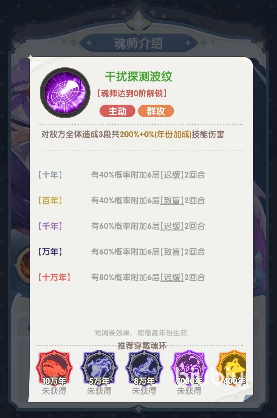 白沉香的主动技能可以对敌方全体造成多段伤害,在提升魂环年限后,还有几率附加迟缓、致盲这两种状态。对方被迟缓后会降低闪避,被致盲后降低命中率,是一个很有价值的限制类型技能。第1个被动先发制人,在战斗开始前随机恢复三个队友50点魂力,提升魂环年限后还能额外提升暴击、伤害加深这两项属性。这样对于团队中的核心输出来说,是非常有效的提升。