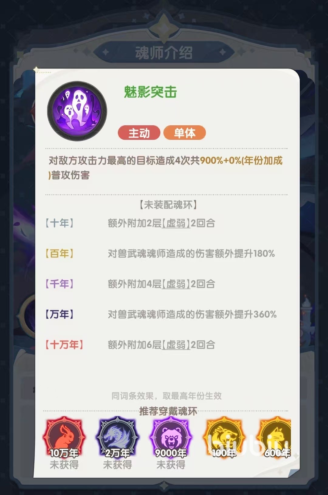 第2个被动效果是发动普攻后,对敌方随机一个目标再进行一次追击。提升魂环年限后,额外附加减防,对兽武魂魂师造成的伤害提升。最后一个被动鬼魅真身,在血量首次低于30%的时候释放真身,对敌方全体附加恐惧一回合,使对方的输出大幅度减少。同时自身进入到虚影状态,额外提升自身防御,对多个目标附加破甲。这个技能的效果比较全面,既提高了自身的生存能力,又削弱了对方的防御,方便后续爆发。