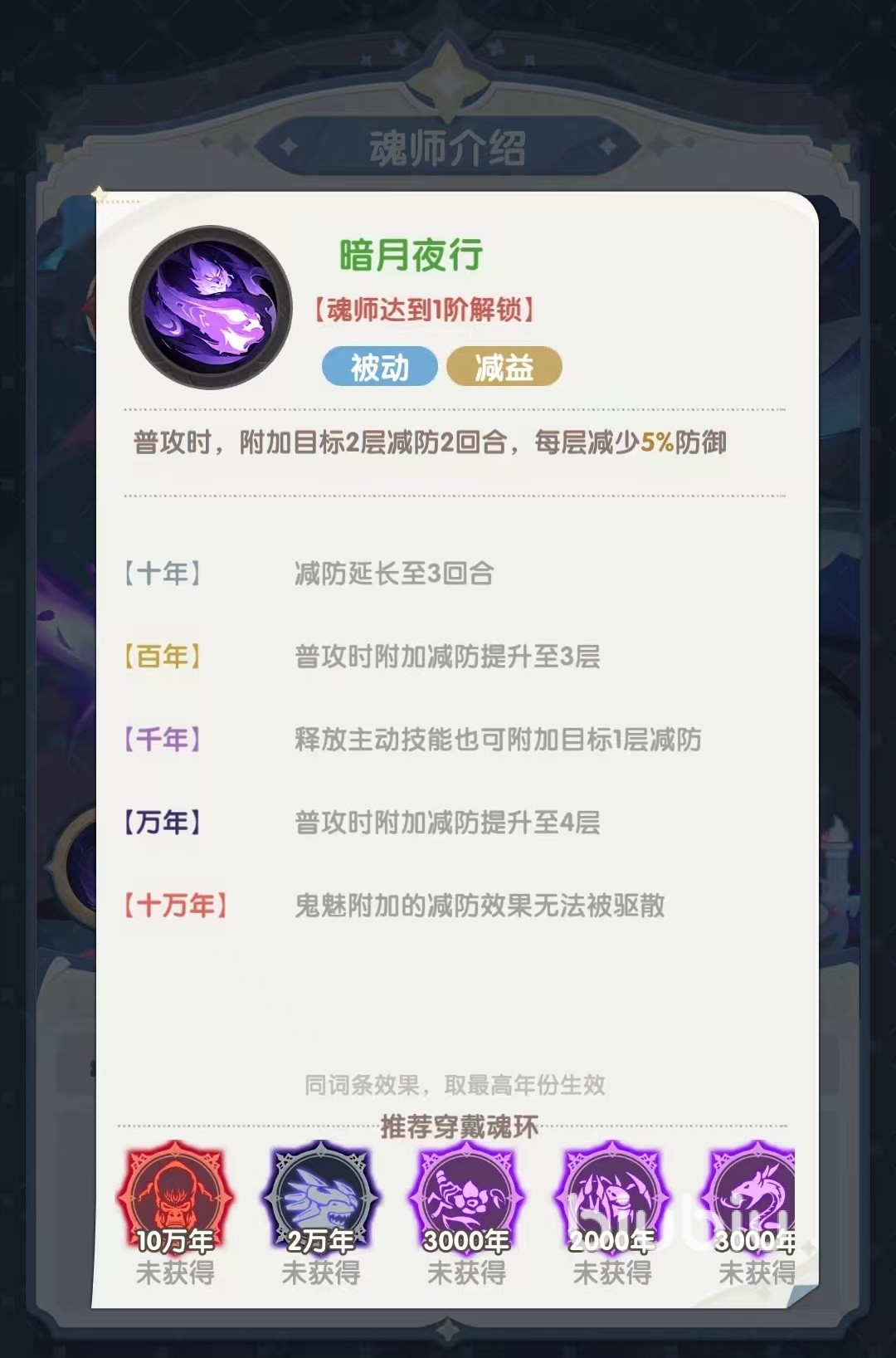 鬼魅的主动技能魅影突击,选择敌方攻击力最高的目标造成多次伤害。在提升魂环年限后,还会额外附加虚弱效果,对方被削弱后会降低攻击力。同时鬼魅对于兽武魂魂师会造成额外的伤害,这一点大家在使用的时候可以利用好,如果对方有兽武魂的魂师,那么就有选择的让鬼魅出战。第1个被动暗月夜行,在普攻时可以给目标附加两层减防效果,每层可降低5%的防御。提升魂环年限后,释放主动技能也可以额外附加减防,最多能叠加到4层,且无法被驱散。降低对方防御后,当然队伍中的其他角色就能打出更高的伤害了。