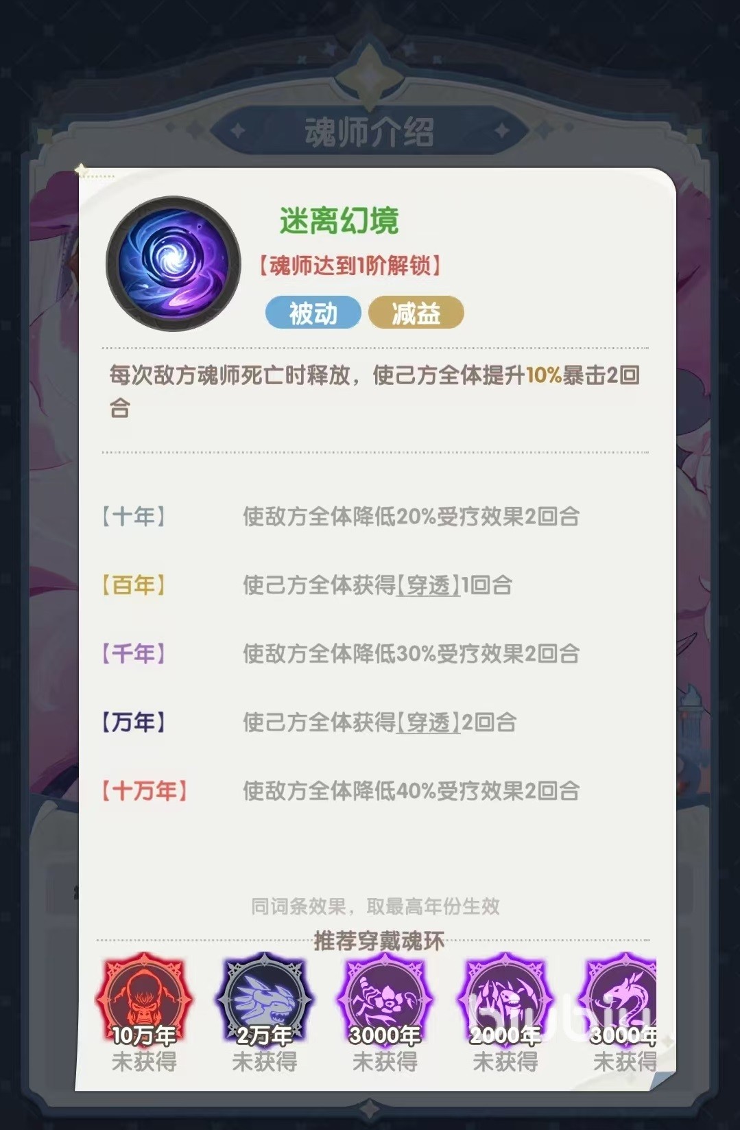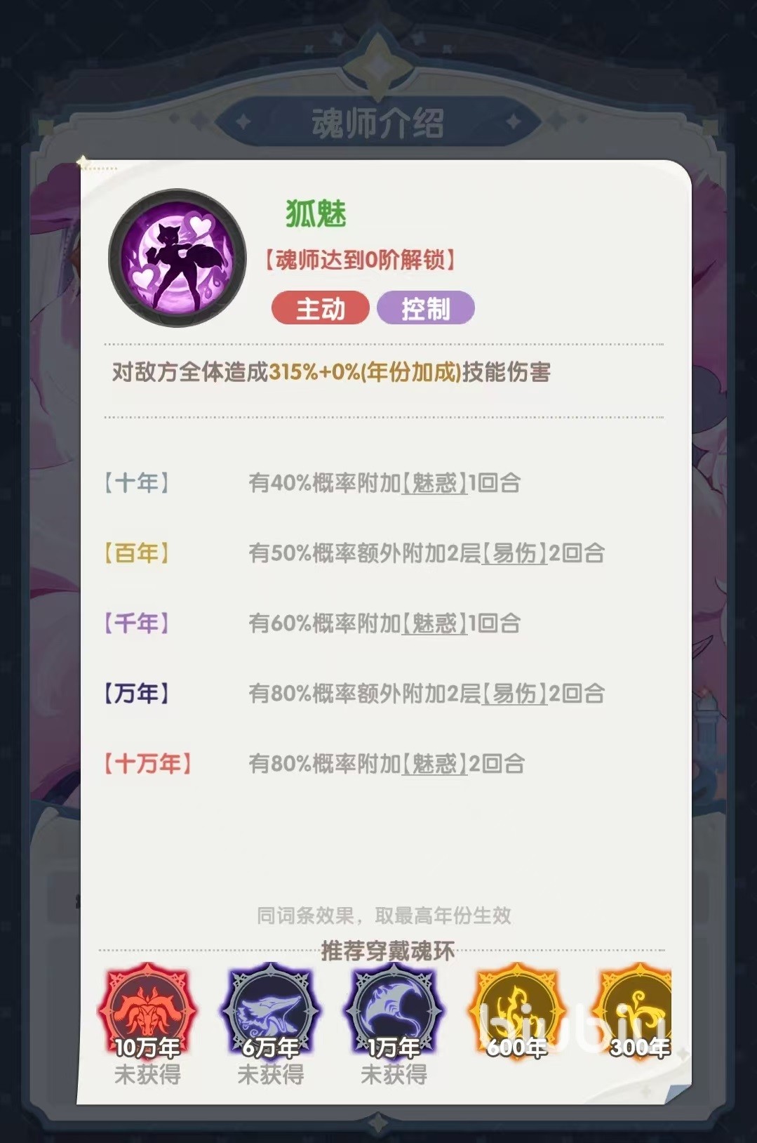 胡列娜的主动技能狐媚,可对敌方全体造成技能伤害,同时有几率附加魅惑和易伤这两个效果。达到10万年魂环时,魅惑的附加概率为80%,易伤的附加概率也是80%,都可以持续两回合。对方被魅惑后无法行动,在此期间受到的伤害无视防御,受到两次伤害后解除状态,易伤效果是使携带者受到的攻击伤害增加,这两个都可以加重对方受到的伤害,所以对强化己方的输出非常有帮助。