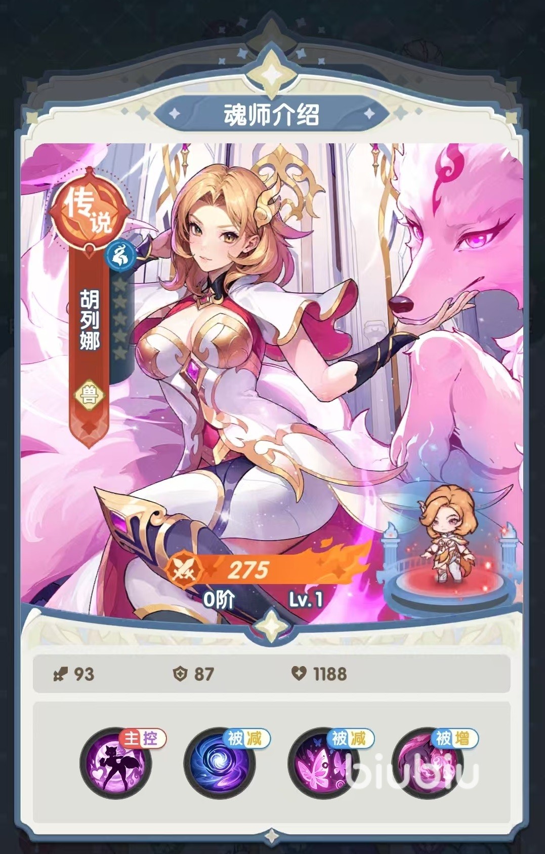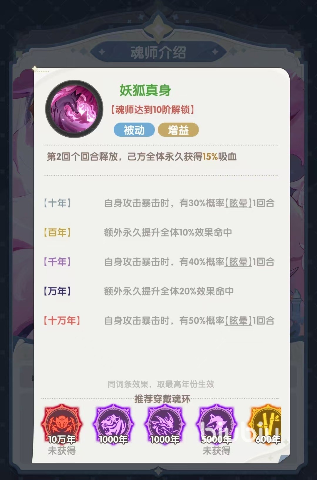 最后一个妖狐真身,第二回合释放,己方全体永久获得吸血加成,在自身攻击暴击时有几率眩晕,还有额外提升全体效果命中属性等。所以作为控制系魂师,胡列娜是非常称职的一个,她不仅可以有效的限制对方,自身在输出方面也非常出色,还可对整个队伍都有伤害方面的加成。阵容搭配小编推荐大家走反击流路线,选择古榕、尘心、胡列娜、邪月和宁荣荣。古榕是很好的前排肉盾,尘心作为强攻系魂师输出很高,尘心和邪月一起配合起来,在胡列娜的控制和增伤辅助之下输出非常暴力。