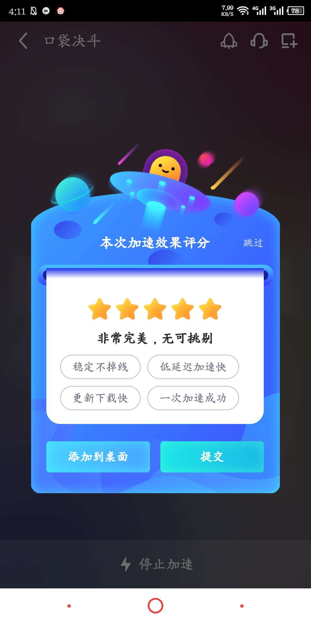 每次停止加速之后,biubiu都会有一个调查小问卷,3星及以下是不满意,选择之后可以在下方点击不满意的原因,四星及以上就是满意,可以点击玩家满意的地方让biubiu加速器继续保持。