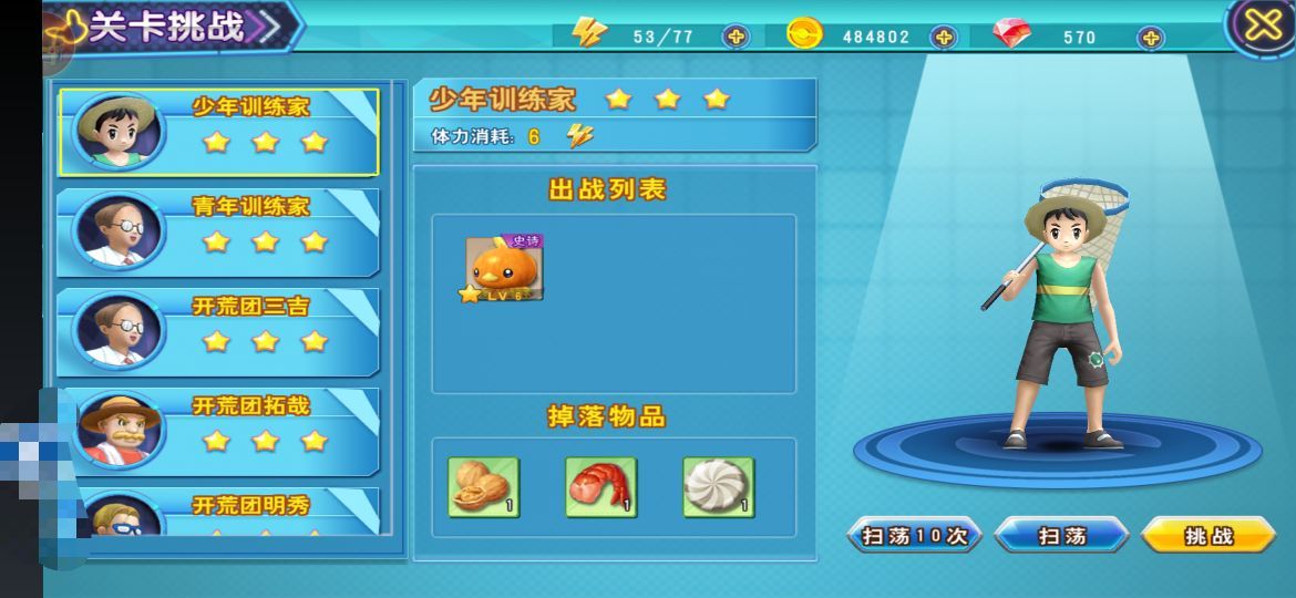玩家可以派出自己最强的队伍,注意宠物之间的相克关系,通过主线关卡,三星就可以进行扫荡,会随机掉落神奇糖果,对精灵使用可以让它们获得一些经验。