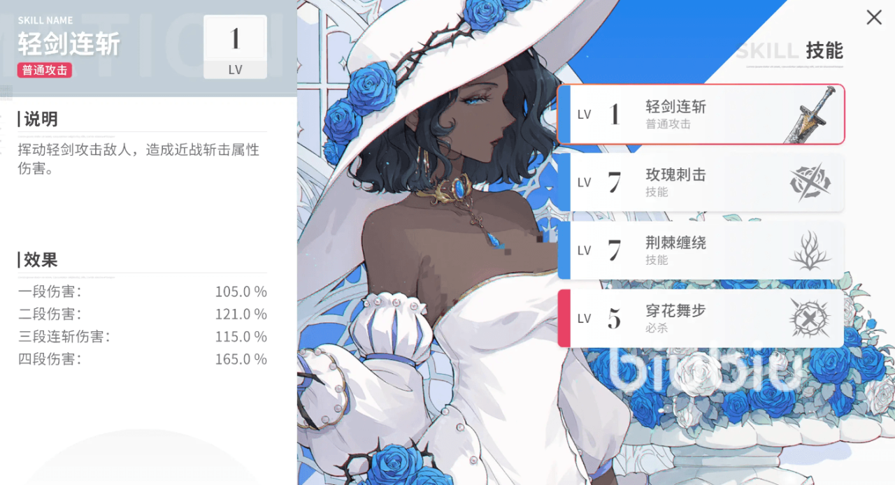 她的普攻会挥动轻剑攻击,总共有四段,最后一段倍率伤害很高,因此每次使用时要尽可能打满,她的第一个技能会朝着指定位置丢出玫瑰,肆意生长的玫瑰会在前方生成一大片竞技区域,对区域内没来得及躲闪的敌人形成多段近战斩击输出并进行禁锢。