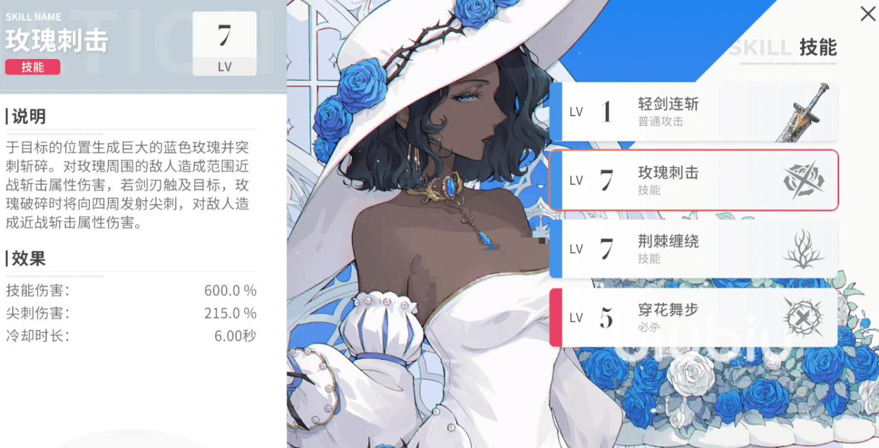 她的第二个技能会在目标位置生成巨大的蓝色玫瑰,然后突刺斩碎,对处于玫瑰周围的敌人形成范围近战斩击伤害,如果是剑刃直接触及目标,玫瑰还会在碎裂的时候向四周发射尖刺,形成一定近战伤害。