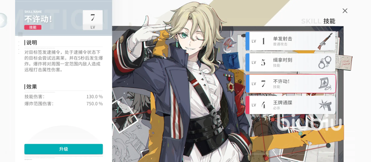 1技能”不许动”,对敌方目标发布“逮捕令”,处于逮捕令状态下的对手会尝试远离该角色,但是在5秒之后会发生爆炸,爆炸会对周围一定范围之内的敌方单位均造成远程打击属性损伤。