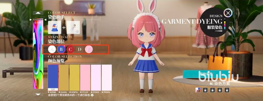 染色是分部位进行的,选择好了染色剂之后,区分部位展开染色,在选择的位置,可以看到对应染色的部位的,点一下会有亮点提示,区分为“A/B/C/D/E”几个不同的部位,点击对应的图标,就能看到人物染色的是哪个部分了,主要是针对服装的五个部位展开染色。