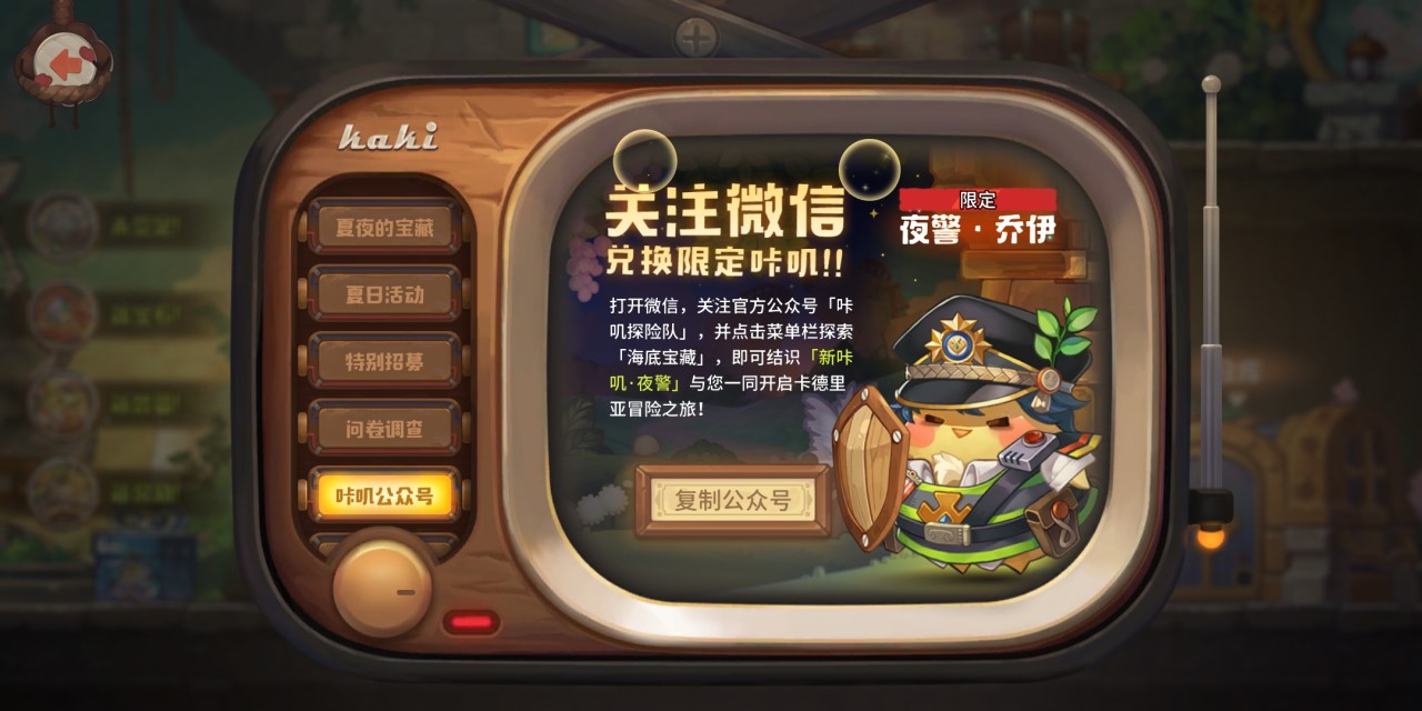 其实还有一种隐藏方法可获得指定咔叽,比如关注咔叽探险队公众号可领取夜警乔伊、首充可领剑豪及夏日活动的专属角色礼包。同理,某些传奇角色在转盘卡池的爆率可能会限时提高,需要在活动界面查看。