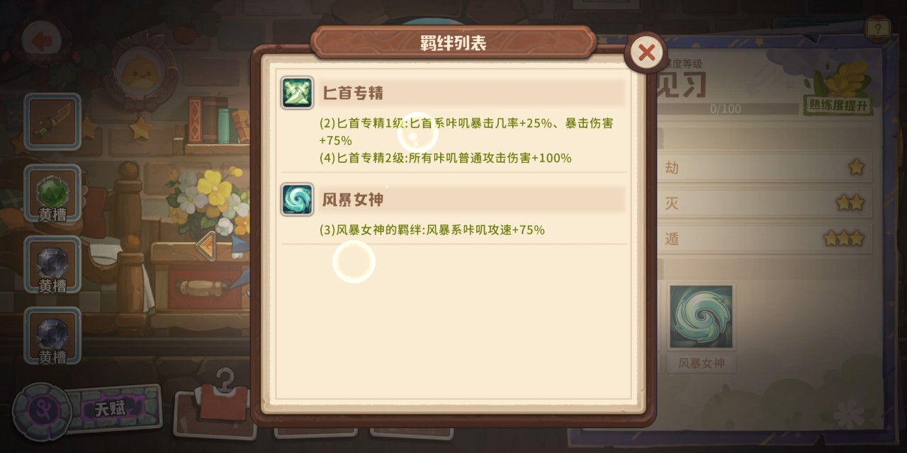 在目前版本中风暴羁绊最适合攻速流,能够直接增加75%攻速。但这里需要注意的是近战组伤害过低,远程组只能打爆发伤害,所以突袭组最适合装上风暴咔叽,如全藏、渔夫等。玩家如果没有以上提到的咔叽也不必着急,可以前往轮盘系统抽取或地下城刷碎片。