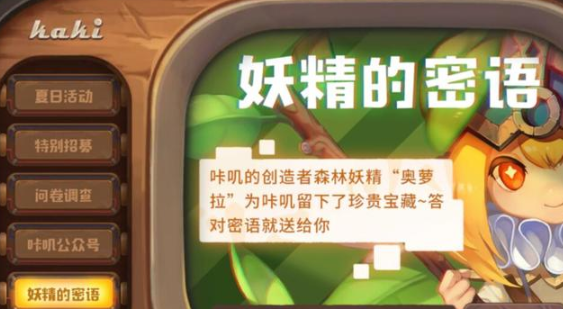 1、进到游戏以后先把密语找到,密语在网上可以搜集。拿齐奖品之后点击游戏界面的右上角,选择妖精的密语,然后验证。