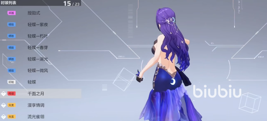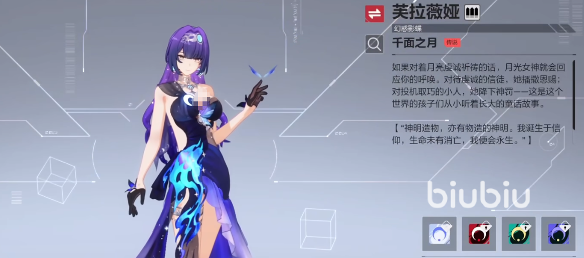 礼服的话,则是一个大露背的设计。里面部分的地方,有一部分会有一些黑丝。然后屁股上的月亮也是会发光,裙子这边质感也很好。里边有三个镂空,加上钻石的点缀,更令人迷醉。另外一边这里有个翘起来的布裙摆,是那种肩膀上的星星沙的感觉,前面这边蓝紫色有流光特效。