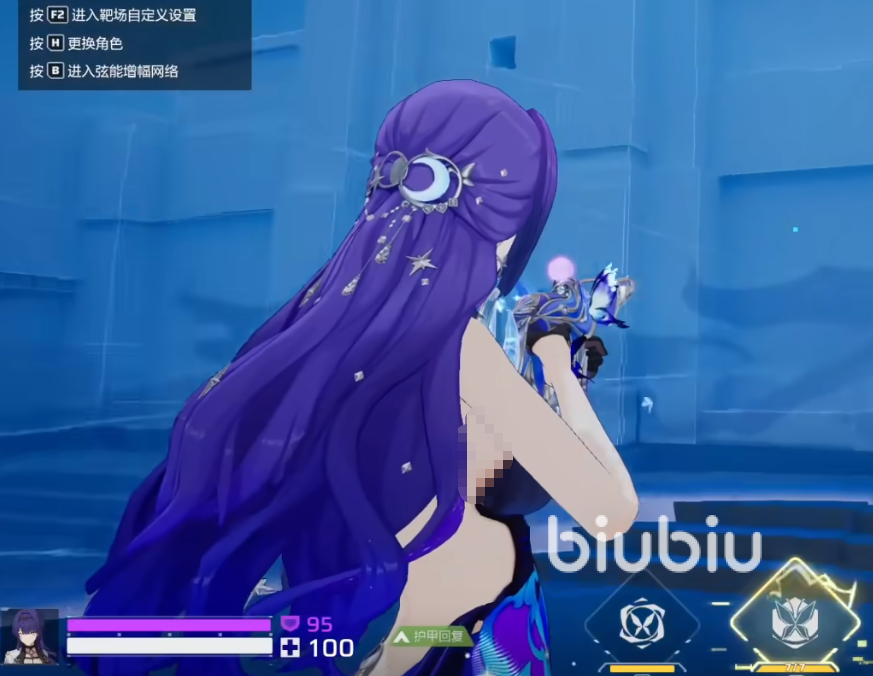 关键造型是月光女神月相优雅礼服和紫蓝黑头发,这款发型看起来是男款泳装的改版,充满了性张力和诱惑感。然后鬓角是改短了,耳朵后面是两簇头发,视觉看起来更加富有层次感。往后扎了一个辫子,显得更加俏皮又可爱。