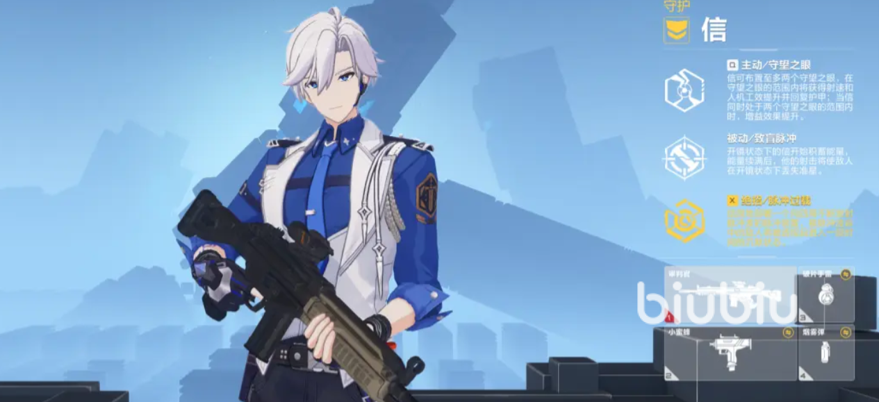 信也是守护,他的被动是在开镜下会积攒能量,能量满后下次射击成功命中,会让目标武器的肩射散布变大,并且在开镜下会丢失准星丧失精准度,他的主动会部署两个守望之眼,自身在守望之眼的范围内会回复护盾、提升射速和人机工效,他的战术技会投掷一个地雷,地雷在部署后会进入隐身状态,敌人靠近才会显形引爆,对范围内的敌人造成持续伤害,他的终结技会放置一个朝四周发射脉冲波的装置,被脉冲波命中的敌人会被透视给队友们并进入一段时间的沉默。