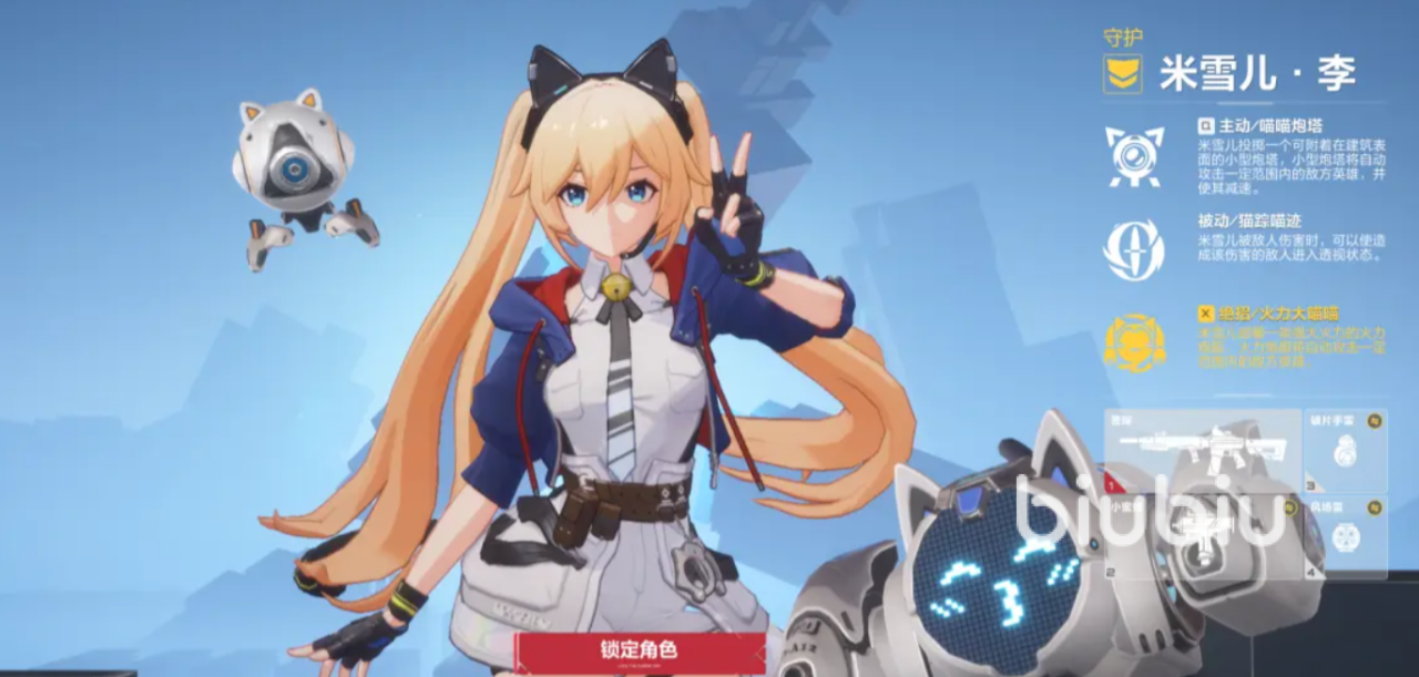 米雪儿是守护角色,她的被动会短暂透视用武器直接命中自己的敌人,主动技会投掷一个附着在建筑表面的喵喵,喵喵会自动攻击范围内的敌人并使其减速,她的战术技也会抛出一个能附着的喵喵,该喵喵会在被激活后对周围敌人造成沉默,她的终结技会召唤一架火力炮艇自动攻击范围内敌人。