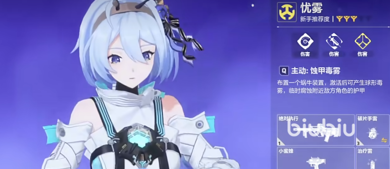 忧雾的被动“毒雾爆发”会在使用主武器,并对敌人的生命值造成一定量的伤害之后,对目标以及附近的其他敌人造成伤害,同时还会临时腐蚀掉他们的护甲上限,方便我方后续进攻。