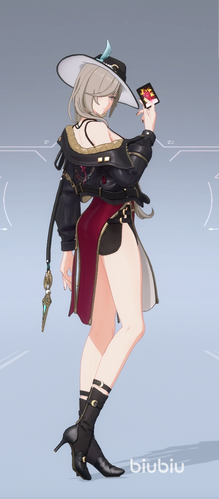 先锋定位的超弦体,是魔术师的身份背景,整体立绘也能看出她艺术家的特质,善于使用卡牌在战场制造魔物,能探测对手动向并进行突袭。在脱离墙面时,被动会在贴墙的地方设置一个能传送的分身,每次下墙都有分身形成,分身受伤,被动进入冷却,这个招式可能短暂探测,查探周围没有障碍物遮挡的对手,并将位置暴露给队友。战术技可制造特殊的分身,分身被摧毁,周围敌人受到闪光效果。大招能对前方任意位置投掷大量的卡牌,每个卡牌都能形成分身,让该她能传送。