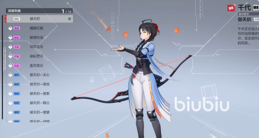千代是游戏里外形十分甜美的一名少女,定位是决斗,使用枫鸣的精确射手步枪。被动”静心凝势”,能持续回复专注度,攻击后,会短暂的减缓回复的速度;在专注值满时,造成伤害后会消耗专注值并在一段时间内强化自己的输出效果。战术技能”滞影贯云”,在蓄力后向对手方向射出一支贯穿箭矢,路径上的目标均受到高额伤害,外加减速效果。
