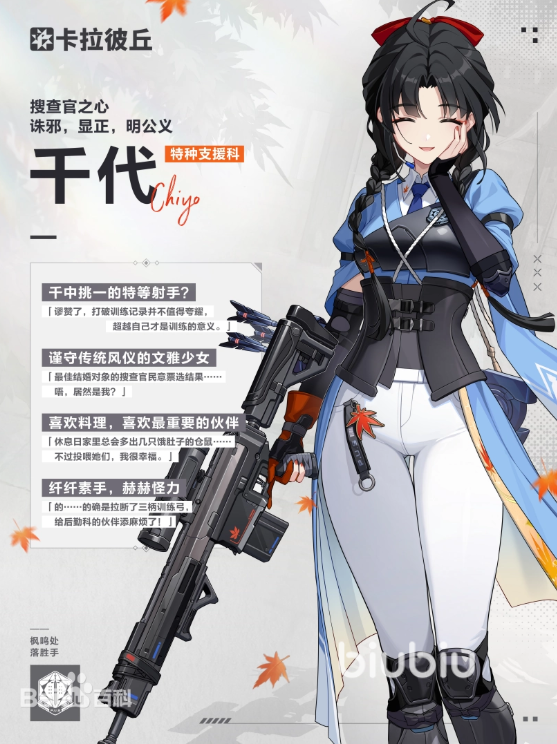 先了解下她的武器”枫鸣”,这是一把精确射手步枪,装配的事全威力步枪弹,具有较强的战斗型,能够适应全天候的战斗,配备了1.5倍的瞄准镜,能在半自动设计模式与全自动设计模式之间切换。